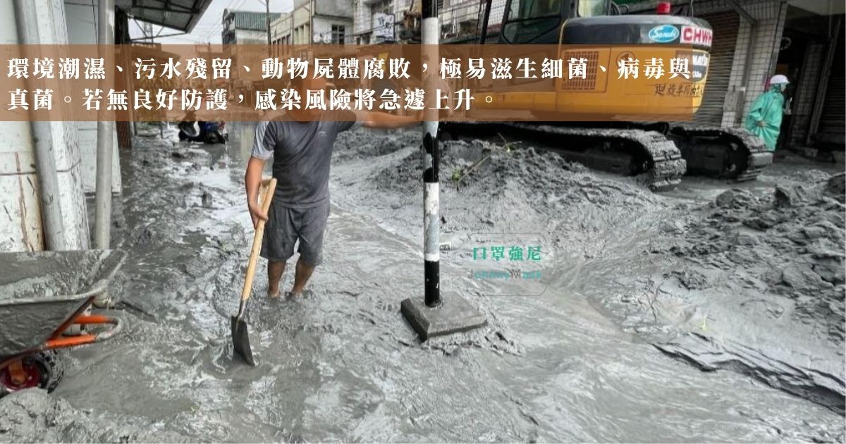洪水退後的環境潮濕、污水殘留、動物屍體腐敗,極易滋生細菌、病毒與真菌。志工若無良好防護,或有開放性傷口,感染風險將急遽上升。