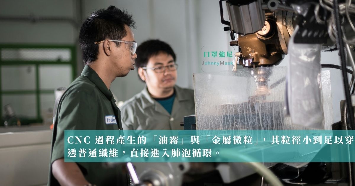 「師傅常說:『這只是油霧的味道,聞久就習慣了。』但你習慣的是味道,肺部卻無法習慣這些細微的化學分子。」許多從事 CNC 加工的從業人員認為,現場沒有傳統電焊的煙塵,只要擋住噴濺的鋁屑或鐵屑就好。這是一個很危險的想法。事實上,CNC 過程產生的「油霧」與「金屬微粒」,其粒徑小到足以穿透普通纖維,直接進入肺泡循環。