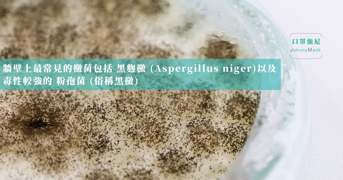 牆壁上最常見的黴菌包括 黑麴黴 (Aspergillus niger)、青黴菌 (Penicillium) 以及毒性較強的 粉孢菌 (Stachybotrys chartarum,俗稱黑黴)。